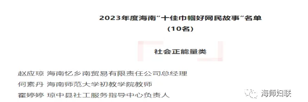 我校何素丹老师获2023年度海南“十佳巾帼好网民故事”