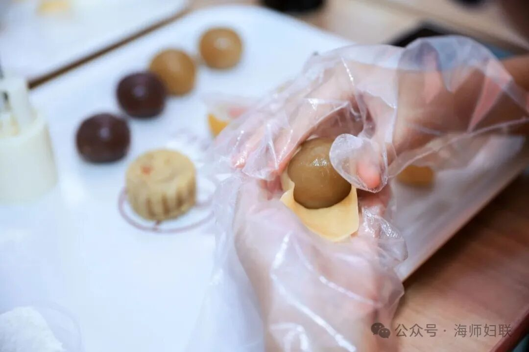 活动伊始,面对初次见到的月饼材料,女留学生们在烘焙师傅细致讲解与亲手示范下,纷纷动手体验——揉面、包馅、压模,每一个步骤都专注投入;师傅穿梭其间,巡回指导,及时点拨。最终,每个人都捧回了图案各异、独一无二的月饼。这些亲手制成的月饼,不只是一份礼物,更是一段可触可感的文化记忆,一份团圆寓意的生动象征。