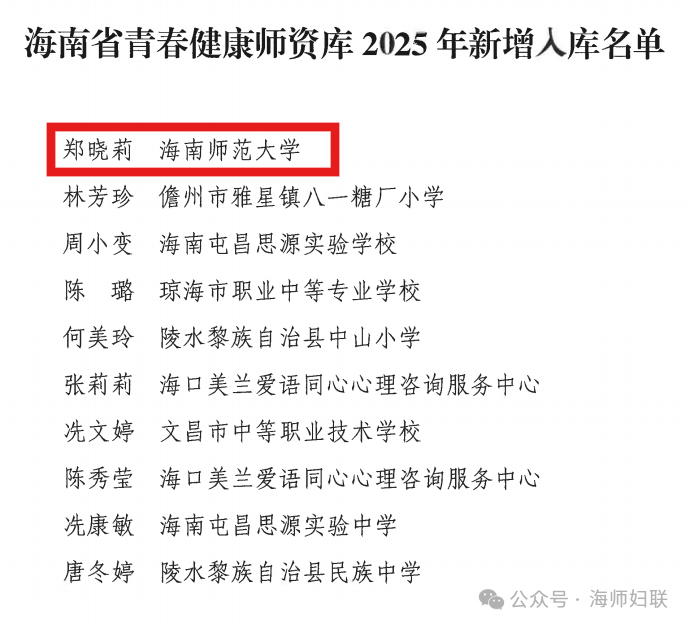 近日,海南省计划生育协会发布《关于海南省青春健康师资库2025年新增入库名单的通知》(琼计生协〔2025〕5号),我校妇联郑晓莉老师凭借扎实的专业能力与突出的综合表现,在激烈竞争中脱颖而出,不仅成功通过省级青春健康师资认证,更以第一名的优异成绩入选海南省青春健康师资库,成为2025年全省新增10名入库师资中最亮眼的一员!