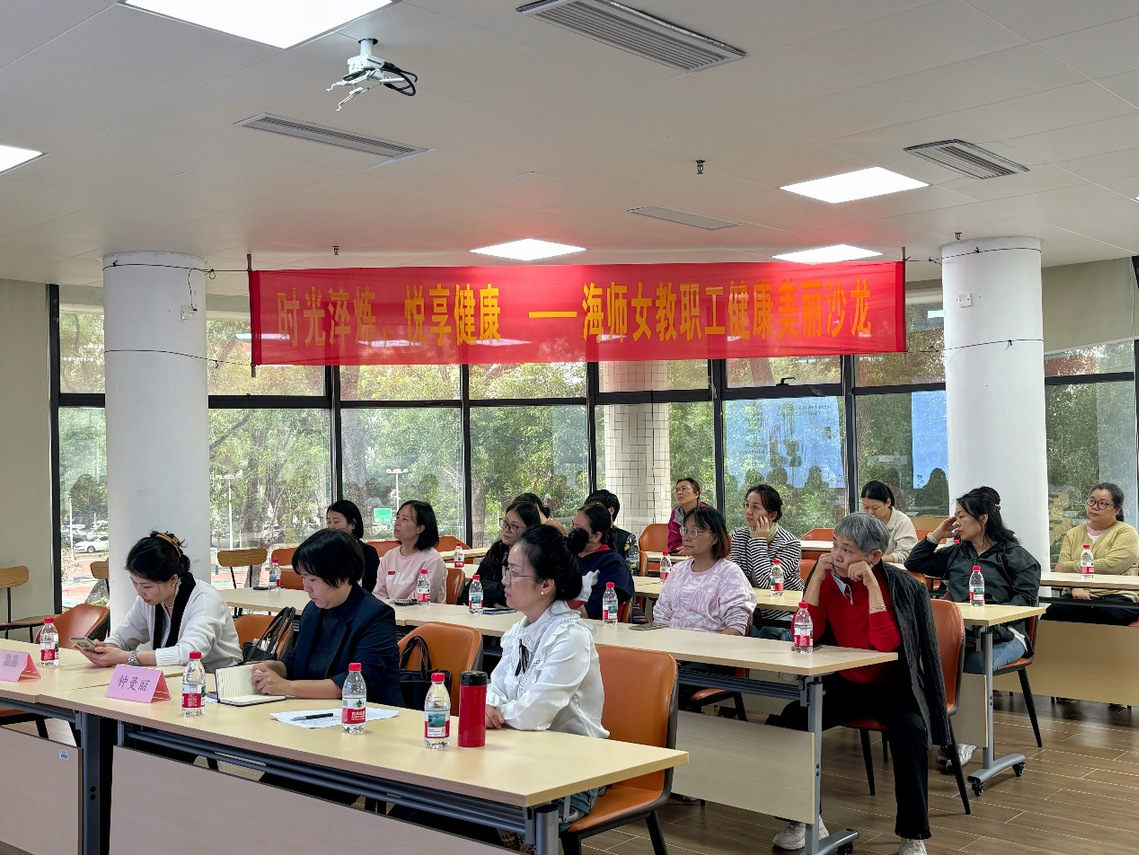 为切实关爱女教职工身心健康,提升健康管理意识与生活品质,2025年12月2日,校妇联在龙昆南校区图书馆二楼校友之家成功举办以“时光淬炼,悦享健康”为主题的女教职工健康美丽沙龙。本次沙龙邀请了海口市妇幼保健医院妇女保健科主任医师王景妹、生殖中心副主任医师温晶主讲,校妇联副主席钟曼丽主持,数十位女教职工共同参与这场兼具专业深度与人文温度的健康关爱之旅。